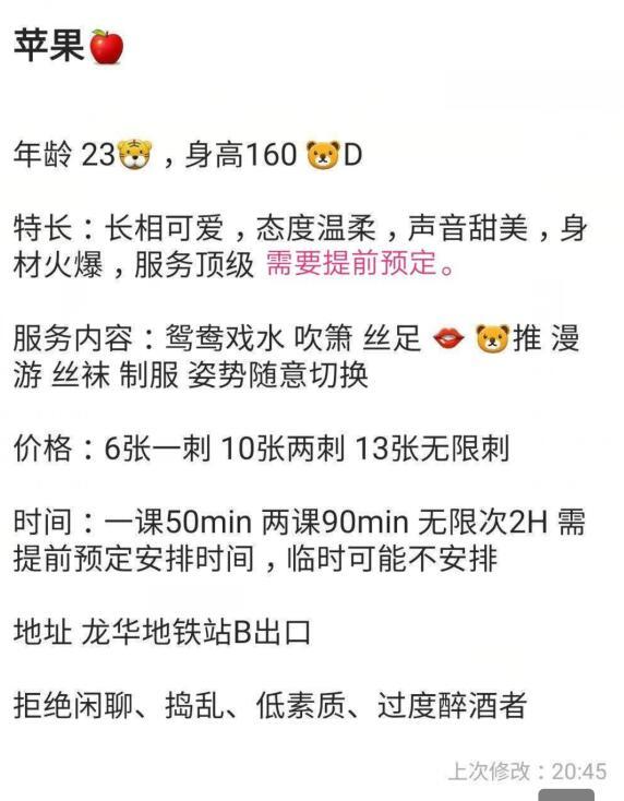 【寻欢细节】:昨天去体验了龙华苹果 发下工兵报告 健谈(不偷钟) 超级骚气 刚进门坐了两分钟 喝了一杯水 妹子就叫我脱衣服 去到洗手间 陪洗开始 中途波推 MB 深喉 随意抱 洗完用一次性纸亲自帮擦 到卧室 有一排制服 问我要哪套 本狼喜欢学生妹 就挑了学生装 但是还是感觉欠点 随即问有丝袜没 嘿嘿 还真有 心里美滋滋 穿上黑丝后 又帮我口 亲吻全身 然后69 妹妹稍微有点黑 不过没异味 可以指扣 然后进入正题 女上背对姿势(这姿势可以边弄边揉胸) 很主动 动的很大力 每次都到底 叫的也很大声 本狼纸老虎 7.8分钟就出来了 总体来说 性价比很高的一次服务 就是时长有点短 一个小时 不过也算600价位中不错的了 可以考虑吃回头草 最后打个分吧 身体8分 脸蛋8分 服务9分 对了 她朋友住楼下 可以SF 价位1200 还有近期准备搬家了 龙华的朋友抓紧了 【附带照片】: