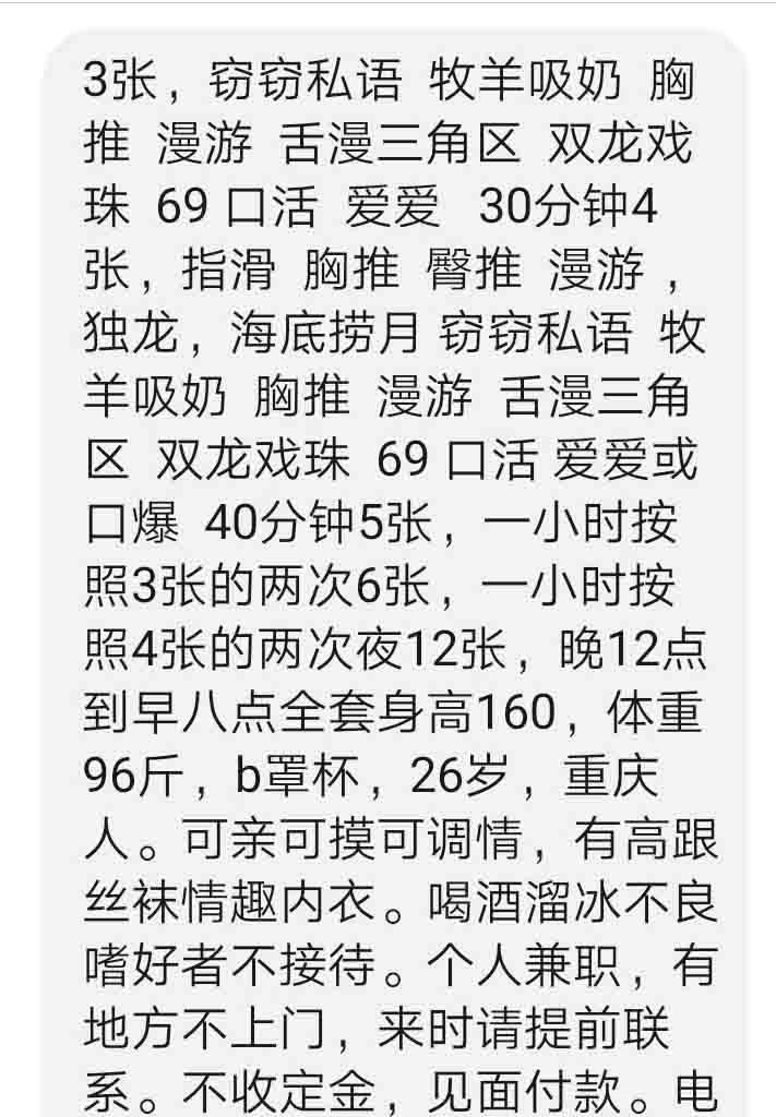 [xinxitop]提示信息[/xinxitop] 【寻欢时间】:2020年5月6日 【寻欢地点】:烟台市、芝罘区 【信息来源】:亲身体验 【服务项目】:漫游,胸推,69式,冰火,口活,爱爱,口爆,毒龙 【妹妹数量】:1 【环境设备】:公寓,1楼有密码门,很安全。 【营业时间】:只要能联系上 【价格一览】:300/次或1200/天等 【安全评估】:评分90。 【服务星级】:★★★★★ 【重点推荐】:毒龙,口爆 【联系方式】:[unfree]VX:QiuXiaoQing1213 电话:15244585383[/unfree] 【寻欢细节】:到地方,妹子从楼上给你开门,进门抱抱,可以洗洗也可以不洗,我做的400的全套。妹子个头不高。过程就那样,所有项目都给做全,也不催人。姿势都配合。 【附带照片】: