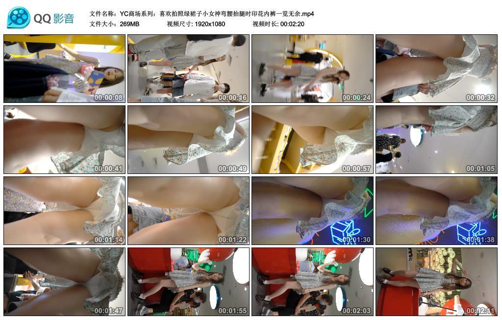 YC商场系列:喜欢拍照绿裙子小女神弯腰抬腿时印花内裤一览无余【02:20/XN】