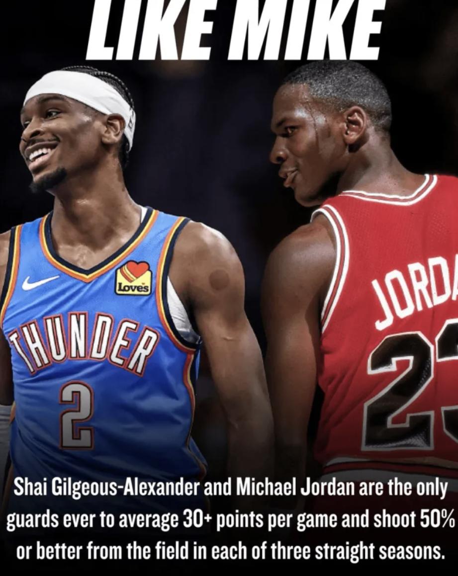 [|篮球赛事] NBA官方:SGA连续3赛季50%命中率场均30+,乔丹后首个后卫 |